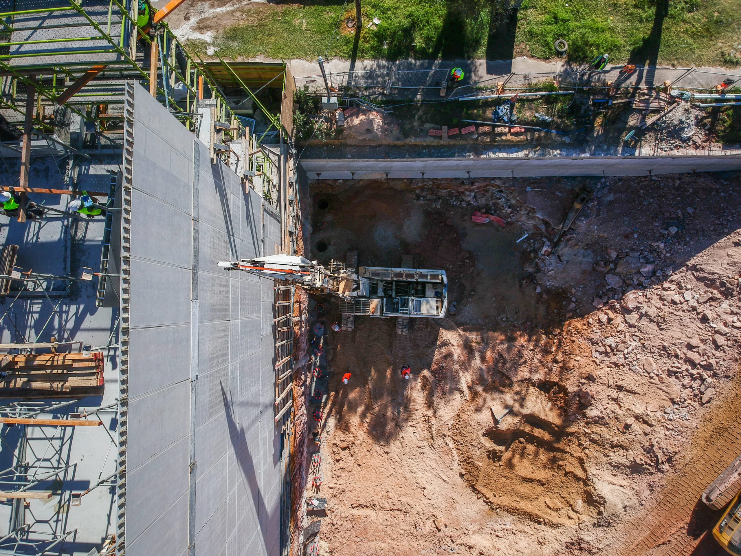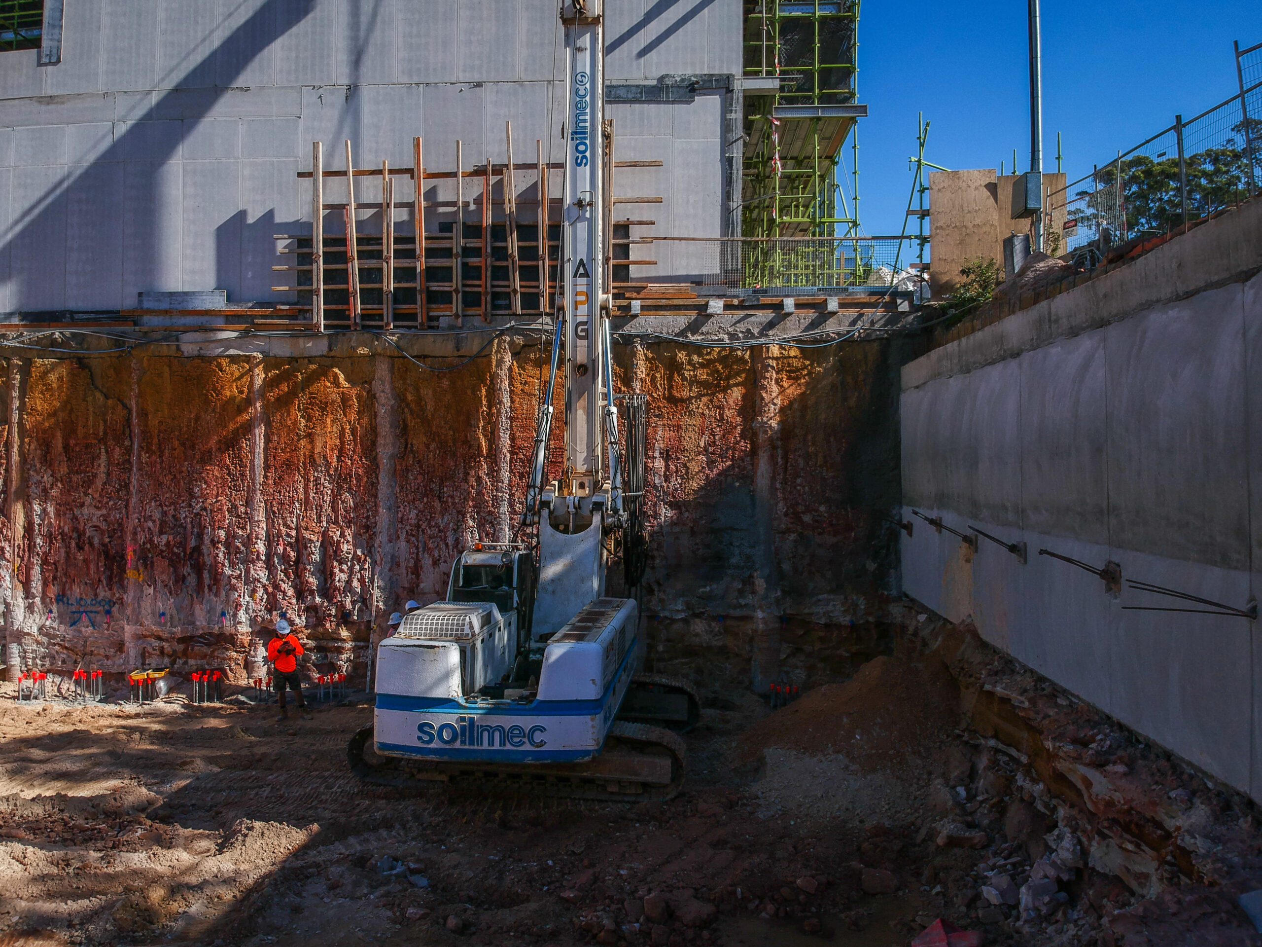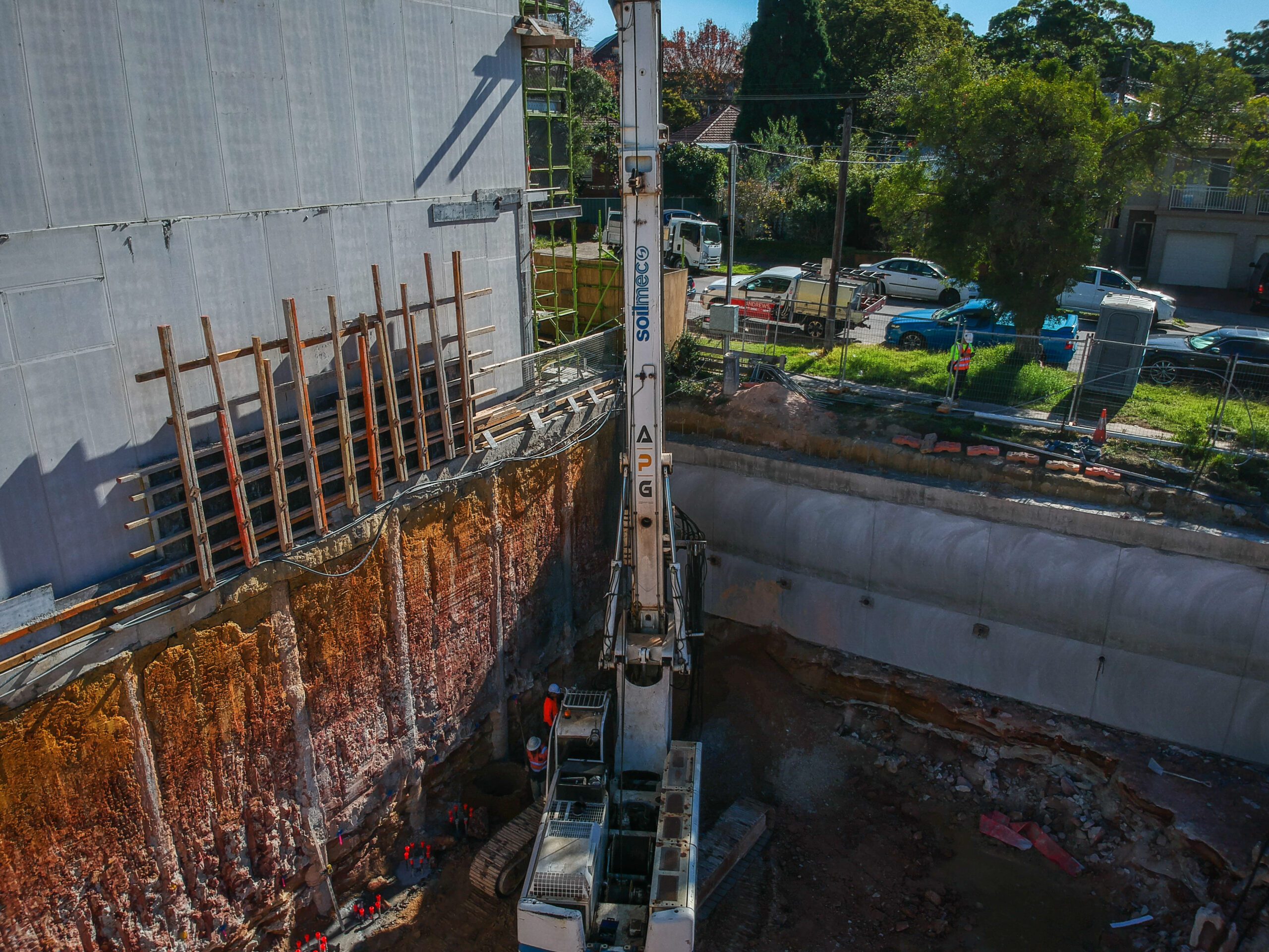 APG constructed the shoring walls to support a three level basement servicing these apartments. With one of the shoring walls hard up against the neighbouring properties retention wall, the challenge was to construct these pile in high strength bed rock, within such close proximity to an existing basement.